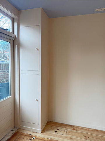 Bij deze verbouwing werkten we samen met Katja Semenova van www.sooftstudio.com voor de interieurdesign. Wij hebben al het houtwerk gedaan, zoals de roomdivider en houten planken. In de slaapkamer hebben we op twee muren decoratieve wandlijsten geplaatst. Ook hebben we overal het stuc- en schilderwerk gedaan, en de houten vloer geschuurd en gelakt. De badkamer en het toilet hebben we helemaal verbouwd.